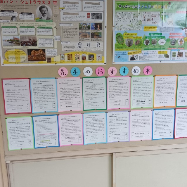 教員のおすすめの本は、図書室の廊下の掲示板に貼ってあります。