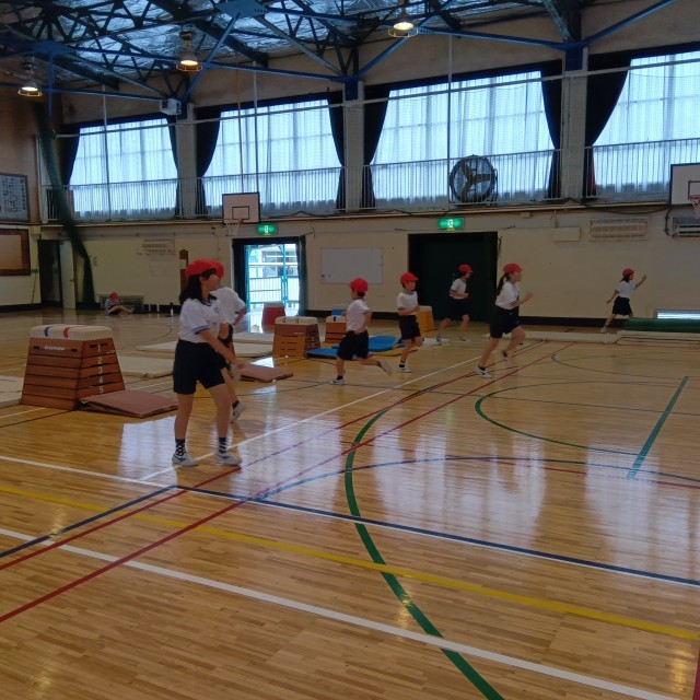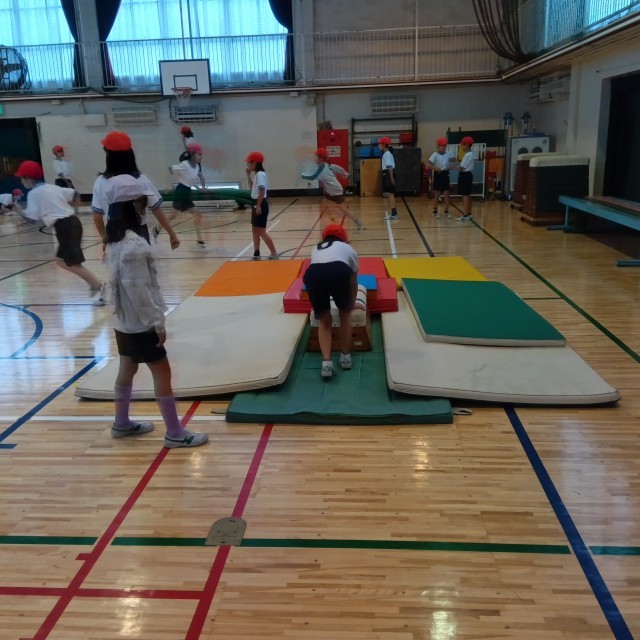 自信ができると、段数の高い場などに移動して練習をしています。高い跳び箱を飛び越すが、目標ではなく正しいフォームで安全に飛び越すことを目指します。