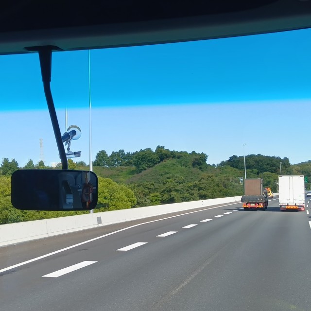 三芳PAでトイレ休憩をとり、現在、バスレクで盛り上がっています! きれいな景色が広がってきました。