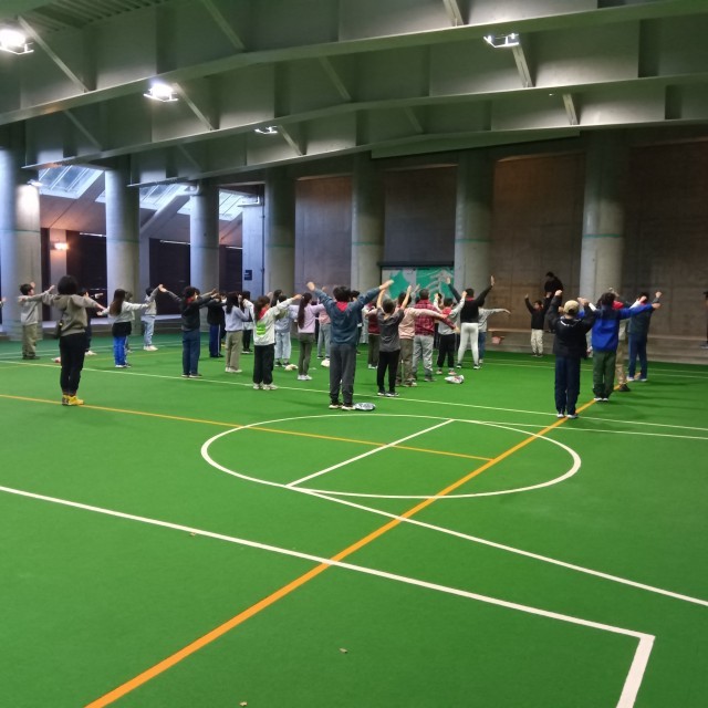 屋根付き広場で、朝の会を行ないました。皆、体調も良く元気に二日目をスタートしました。
