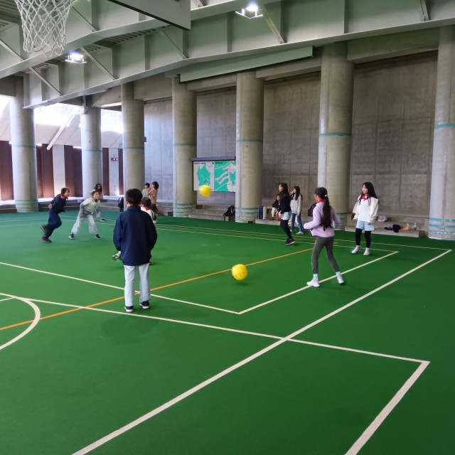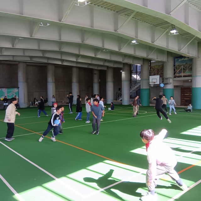 屋根付き広場で、「なかよしタイム」の時間です。白熱したドッジボールの試合でした。