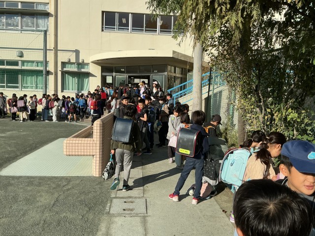 朝、校舎内に入る様子です。学年ごとに整列して待っています。