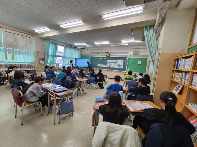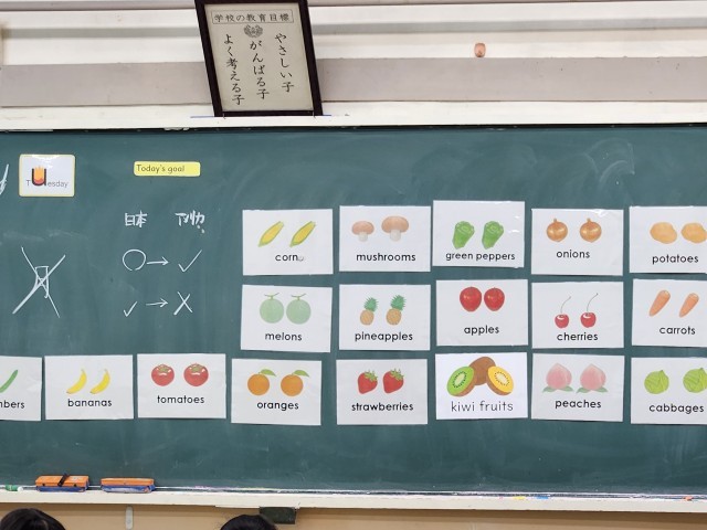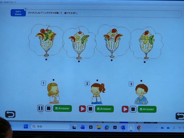 が、ネイティブな英語で、子どもたちに指導を行います。今日は、フルーツパフェを教材にして、果物の発音を学んでいます。