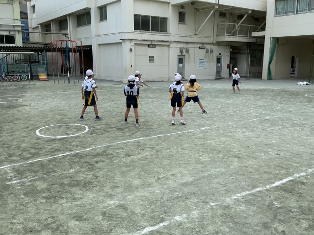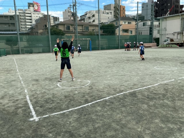 オリジナルルールでのタグラグビーです。4つのターゲット(ゴール)を狙ってパスやランをつないでゲームを進めています。