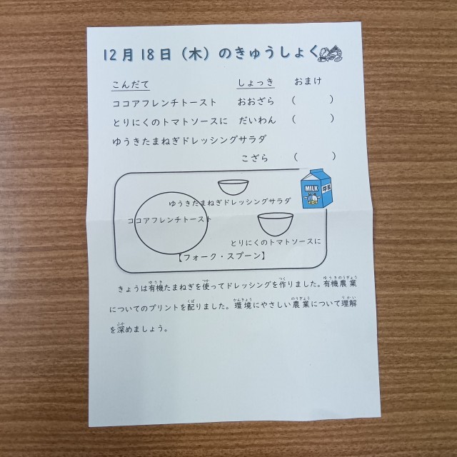 栄養士が、有機野菜についてのプリントを作成し、各教室に配布しました。食育として、子どもたちに伝えています。