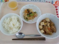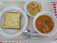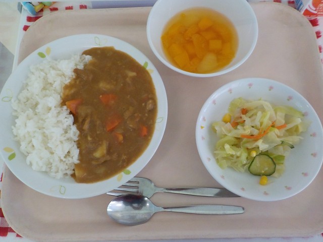 本日の給食は、三宿カレーライス・フレンチサラダ・フルーツポンチ・牛乳です。