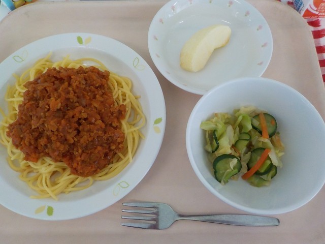 本日の給食は、スパゲッティミートソース・たまねぎドレッシングサラダ・りんご・牛乳です。