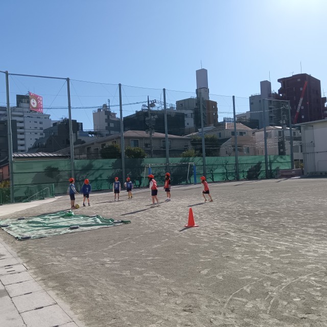 2年生のボールゲームです。ルールを考え、主体的にゲームを進めることができています。