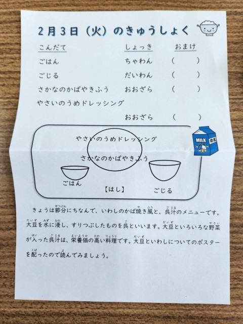 昨日の全校朝会において、節分と立春を話を全校に伝えました。今日の給食は、節分にちなんだ献立になっています。