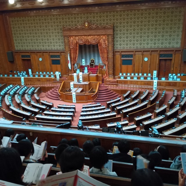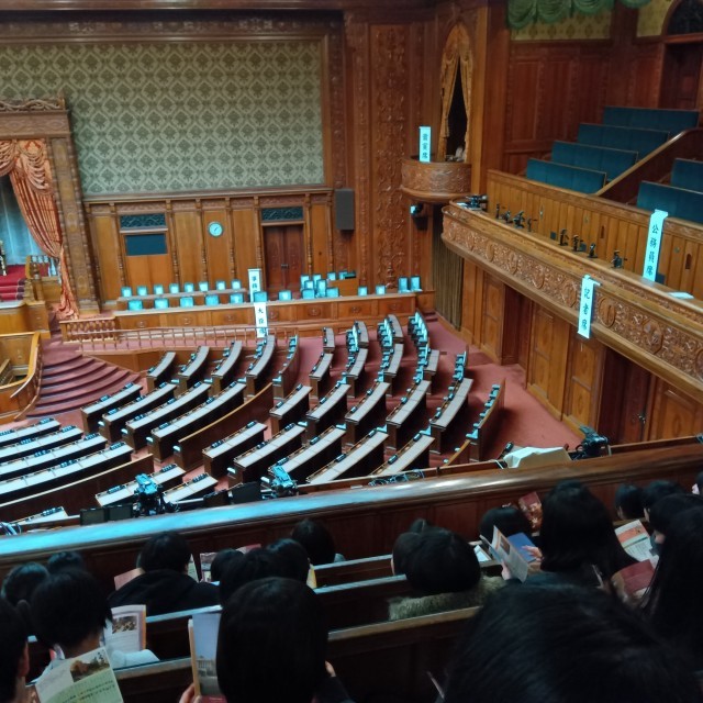 本会議場を見学しています。説明をきいておます。