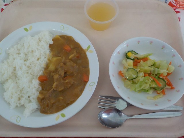 本日の給食は、三宿カレーライス・フレンチサラダ・りんごゼリー・牛乳です。
