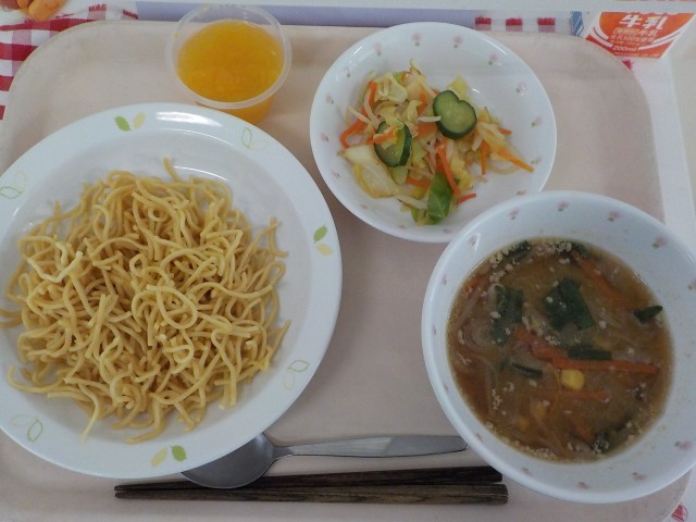 本日の給食は、味噌ラーメン・中華あえ・つぶつぶみかんゼリー・牛乳です。