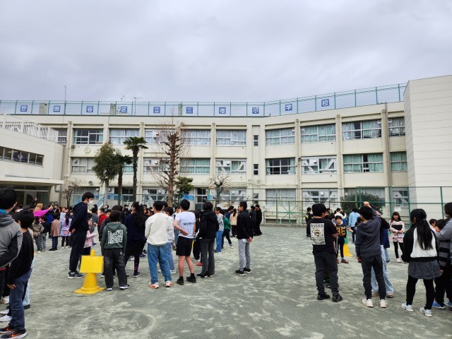 本日、今年度最後の児童集会です。バースデイチェーンというゲームです。声を出さずに誕生日順に並ぶゲームです。