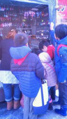 子どもたちが何をおみやげにしようか考えて買いものをしています。楽しそうです。
