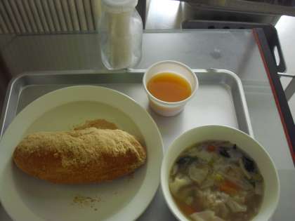 今日の献立は、あげパン、牛乳、ワンタンスープ、キャロットゼリーです。