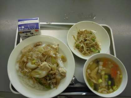 今日の献立は、豚丼、ドリンクヨーグルト、みそ汁、ごま酢かけです。