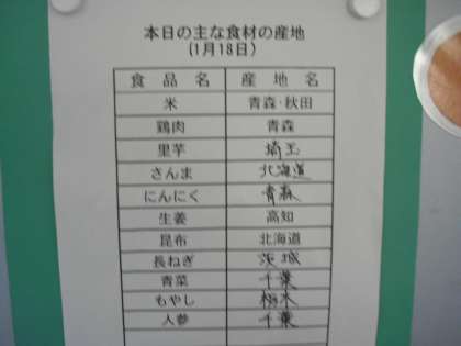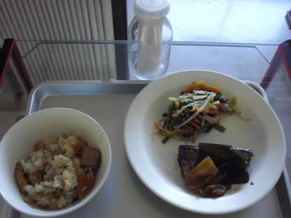 今日の献立は、里芋ごはん、さんまの松前煮、野菜のごまだれかけ、牛乳です。