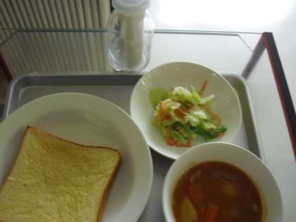 今日の献立は、フレンチトースト、牛乳、ビーンズシチュー、キャベツサラダです。