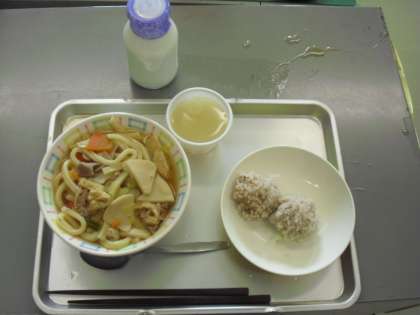 今日の献立は、珍珠丸子、牛乳、煮込みうどん、りんごゼリーです。