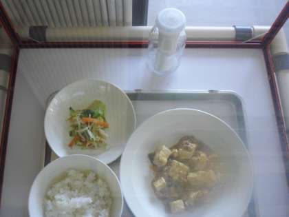 今日の献立は、ごはん、牛乳、マーボー豆腐、白菜の中華サラダです。