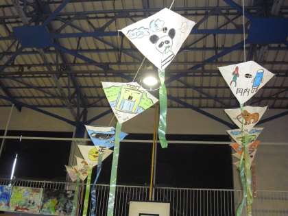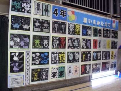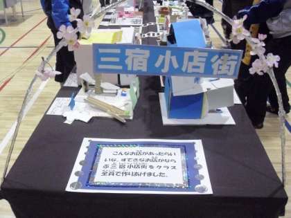 4年生は、平面「願いをかなえて」、立体「三宿小店街」「風に乗って」、総合的な学習の時間で取り組んだ「トライオーリサイクル 休憩処」を出展しました。