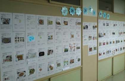 家の人やお友達と作った「かみかみクッキング」の作品がたくさん集まりました。どの作品も工夫されていて、とても美味しそうです。この中から、給食の献立に採用されることもあります。楽しみにしていてください。(保健室前に掲示してあります。)