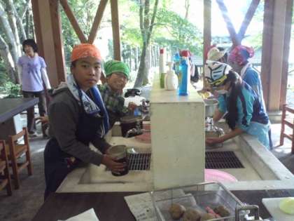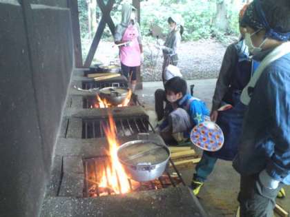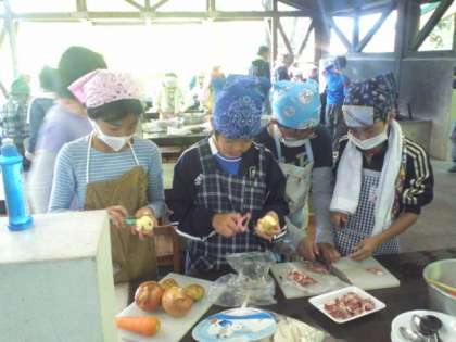 かまど係・野菜(カレー)係・ごはん係りに別れてカレーライスをつくります。美味しくできるかな?