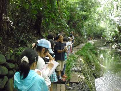 2.等々力渓谷、国分寺から続く崖線には地層が現れています。「世田谷にもこんなとこ ろがあったんだ。」子どもたちは驚きの声をあげ、自然を満喫しました。