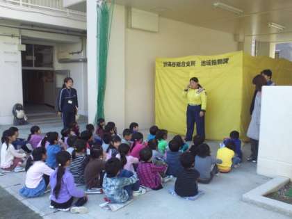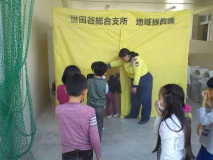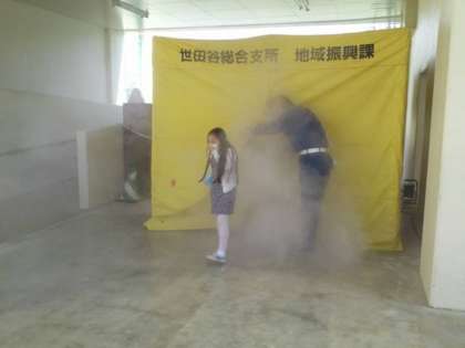 避難訓練の後、1・3・5年生が世田谷区の防災課の方から火災時の煙についてお話を伺い、実際に煙体験をしました。