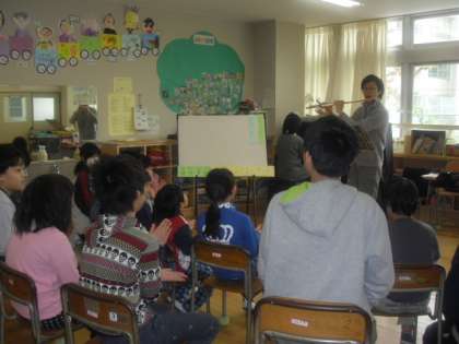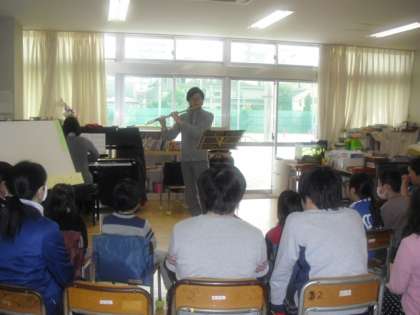 心地よいフルートの音ににうっとり・・・最初の曲はメンデルスゾーンの「うたのつばさ」です。次の曲はみんながよく知っているガボットでした。思わずからだが動きだし、手拍子が始まりました。