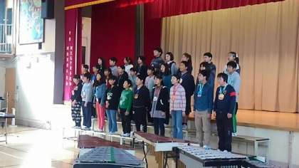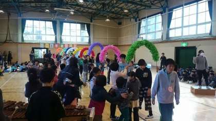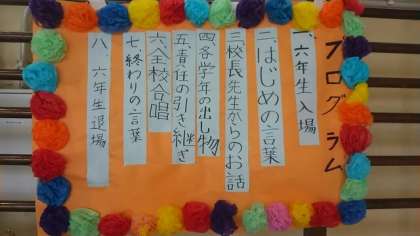 6年生を送る会を1校時に行いました。6年生への感謝の気持ちを、各学年が出し物で伝えました。写真はプログラム、6年生入場(1年生からメダルのプレゼント)、雛壇に立つ29名の6年生です。