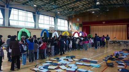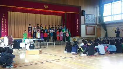 工夫された各学年から出し物で、心温まる6年生を送る会になりました。写真は、出し物(5年生)、責任の引き継ぎ式(6年生から5年生へ)、退場の様子です。