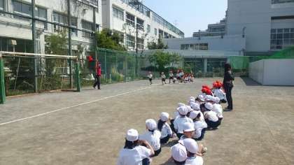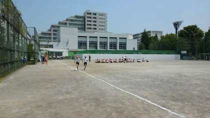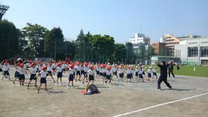 池尻小学校の校庭をお借りして、50m走の記録を取りました。「なぜ?」と思われる方もいらっしゃると思いますが、三宿小の校庭では、直線で50mをとることができないからです。池尻小の広い校庭で、思いっきり走りました。