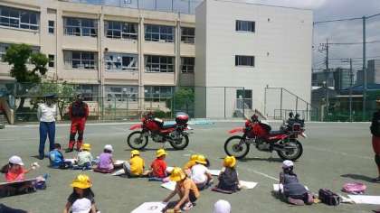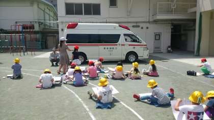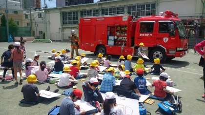 3・4時間目に、1・2年生が「はたらく車」の写生会を校庭でしました。消防車、救急車、赤バイクの中から好きな車を選んで画用紙いっぱいに描きました。