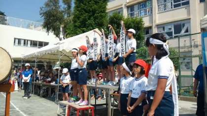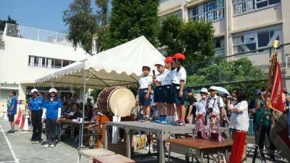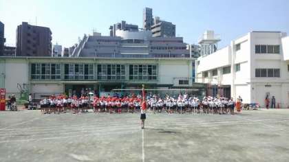 快晴のもと、三宿小学校の運動会が始まりました。入場、開会式(1年生の言葉、スローガン・マスコット紹介)をしました。白熱した運動会が始まります。