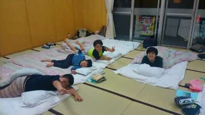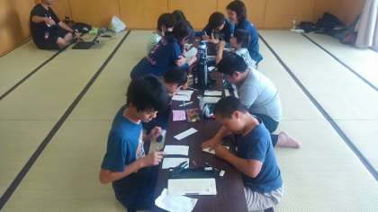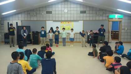 お手紙タイムです。移動教室の出来事を思い出してお手紙を書きました。食事の後に、弦巻小・山崎小・旭小の4校で子ども会をしました。一緒にゲームをしたり歌を歌って、お友だちがいっぱいできました。今夜はぐっすり眠れそうです。全員元気です。おやすみなさい。