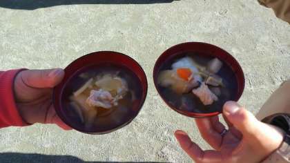 全員でついたお餅をお雑煮にして食べました。遊んだ後のお雑煮はとても美味しかったです。PTA 、地域の方々、おやじの会の皆さま、ありがとうございました。