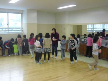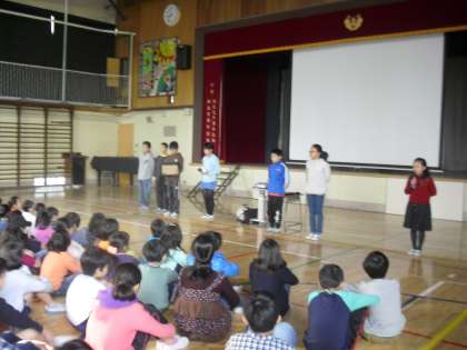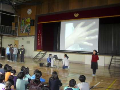 保健給食委員会集会で、手洗いについて発表しました。『きれいな手の洗い方』や、『流水だけの手洗いと石けんでの手洗いの実験と結果』について説明しました。昼休み希望者に手洗いの実験をしました。