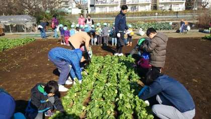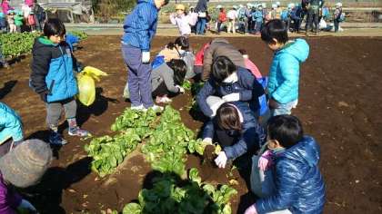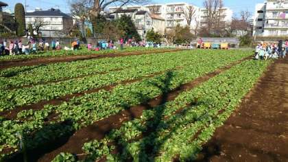 秋山農園で小松菜取りをしました。行きは1時間歩いて、帰りはいっぱいの小松菜を持って、バスで帰ってきました。みんなで力を合わせて、上手に取ることができました。