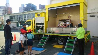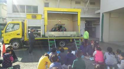 今日は避難訓練のあと、2年生・4年生・わかば学級が起震車体験をしました。震度7を実際に体験し、地震の怖さ、地震が起きたらどうしたらよいのかを学びました。