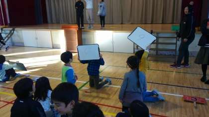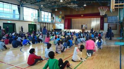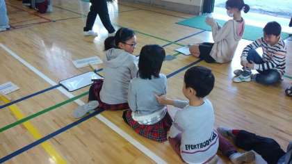 体育館でたてわり集会をしました。背中に指で文字を書いて、伝言するゲームです。約10人の背中に書き伝えるうちにどんどん変わっていく班もありました。