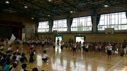 運動会(30日)に向けて、体育館で初めての応援練習をしました。赤・白に別れ、気合いが入った応援合戦になりました。