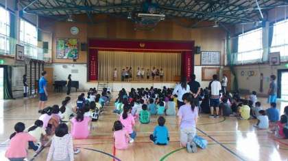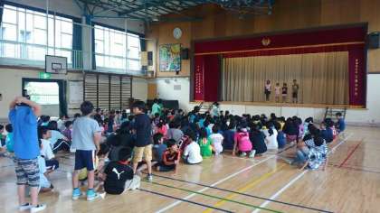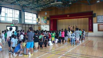 今日の集会は「上か下か? 」クイズでした。 問題例は「ボップの前にあるたぬきの身長は1mである 」正解は「80cm」で、1m より低いので座っている人が正解になります。 全部で10題出され、三宿小のことがよく分かりました。