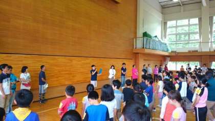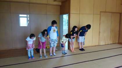 河口湖移動教室最終日…全員元気です。天気は曇りです。朝食後、荷物整理、清掃、閉園式をして、河口湖と富士山にお別れして恩賜庭園に行きます。よい思い出ができました。
