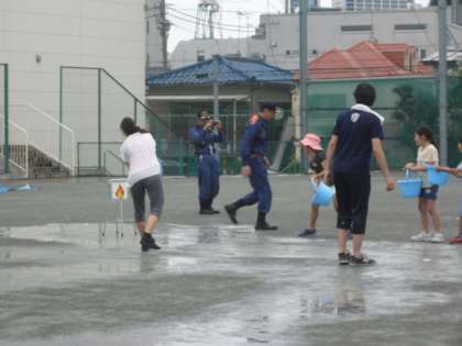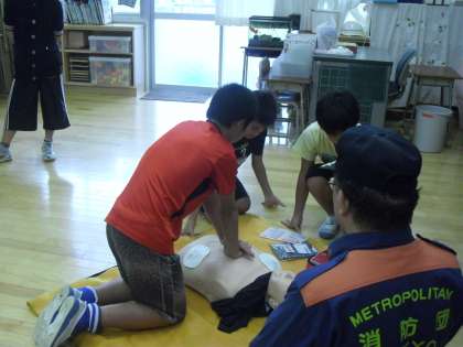 7月18日(土)19日(日)に「親子・地域の絆を深める防災体験」新サバイバルキャンプを行いました。ワークショップ1では、児童・保護者・地域の方々と一緒に煙中避難訓練や心肺蘇生法(AED)、消火器訓練、三角巾救急法、バケツ投水訓練など様々な体験をしました。消防署や消防団の方々にもご協力いただき有意義な時間となりました。