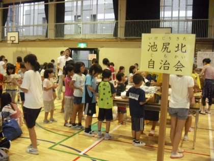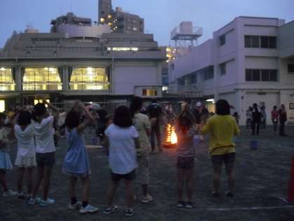 ワークショップ2では、避難所体験としてカレー作り、キャンプファイヤー、宿泊を行いました。普段食べないα米を使用したカレーライスが夕食でした。キャンプファイヤーの前には雨上がりの虹も見ることができました。校庭にテントを設営したり、体育館に宿泊したりする機会はなかなかないので、夏休み最初のよい体験となったことでしょう。
