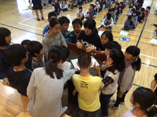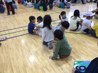18のたてわり班に分かれ活動しました。内容は、一列に並び、前の人の背中に文字を書いて先頭の人まで伝えるゲームです。どの班も協力して正解していました。