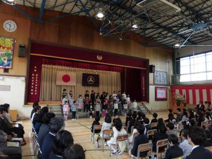 4月6日、50人の1年生が三宿小学校に入学しました。校長先生のお話を聞いたり、元気に返事をしたりしました。2年生は歓迎の出し物を立派に行いました。