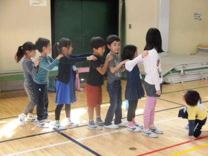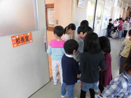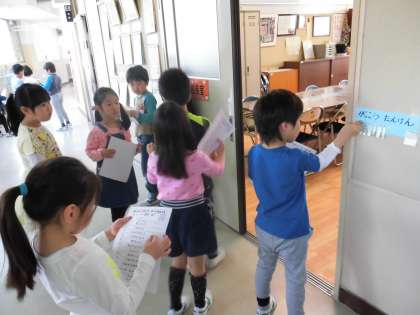 今日の1、2校時に2年生が1年生に学校内を案内しました。1年生は2年生の説明をきちんと聞いていました。探検が終わると、体育館でなかよくグループ遊びをしました。