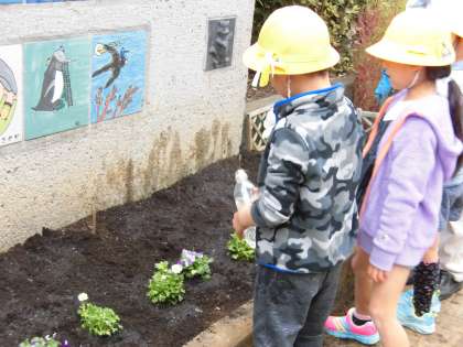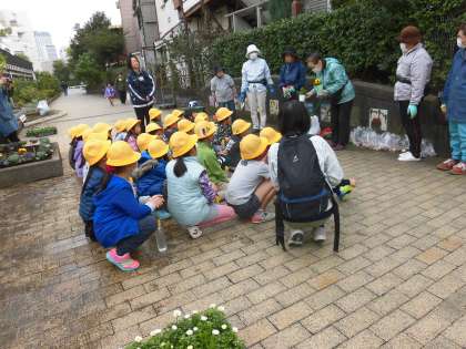 1年生が、『楽働クラブ』のみなさんに教えていただきながら緑道に花を植えました。チューリップやスイセンなどの球根やパンジーやノースポールなどの苗を植え、水もしっかりかけました。これから緑道を通るときに、自分が植えた花を見るのが楽しみです。
